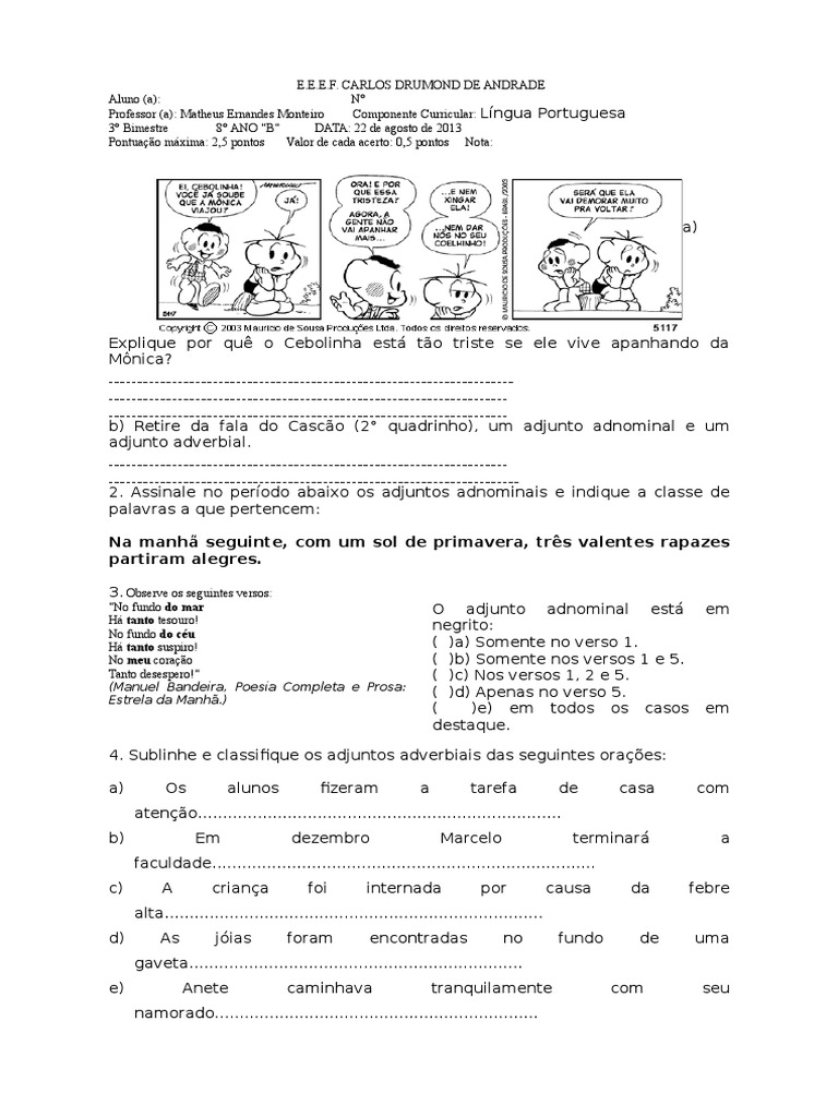 Atividade De Portugues Adjunto Adnominal Na Tira 9º Ano