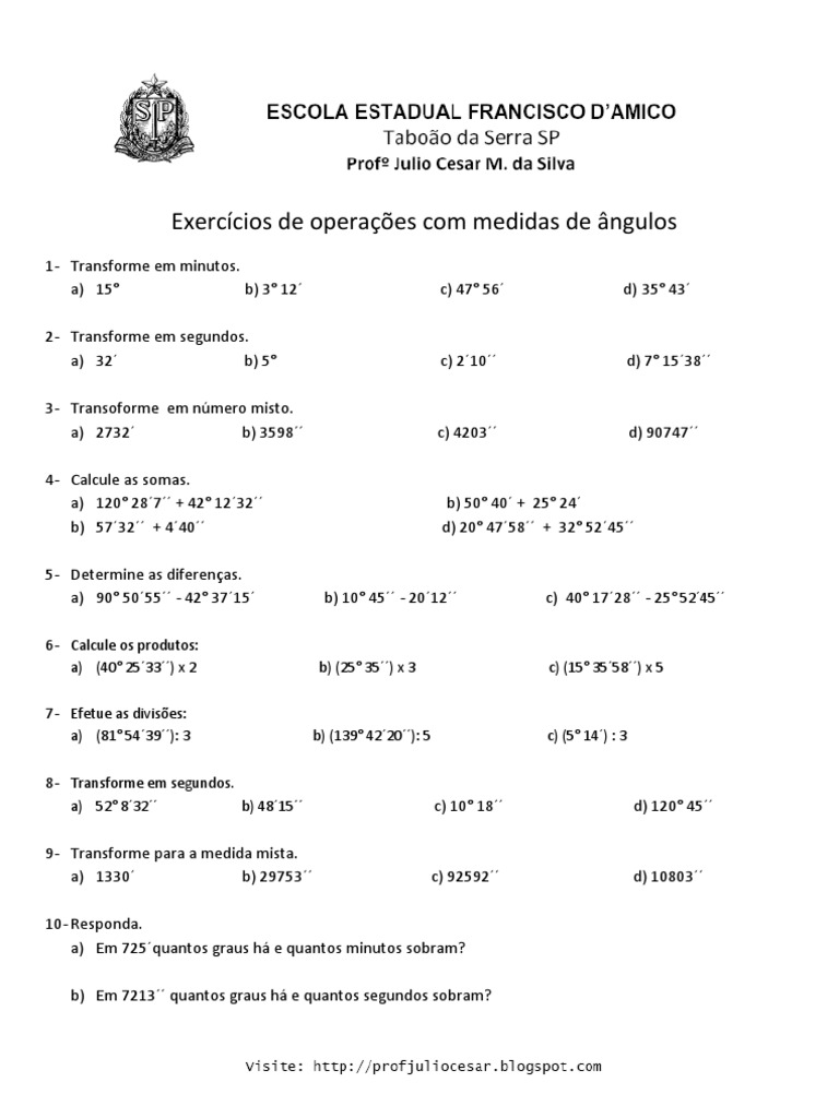 50 Angulos Complementares E Suplementares Exercicios 7o Ano Doc