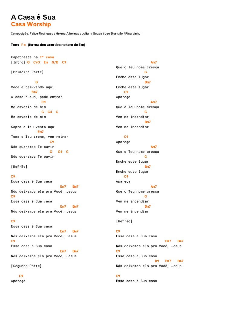 Apareça que o teu nome cresça enche este lugar enche este lugar. Enche este lugar c apareça am que o teu nome cresça g vem me incendiar d vem me incendiar c apareça am que o teu nome cresça g. C9 apareça am7 que o teu nome cresça g enche este lugar d f enche este lugar c9 apareça am7 que o teu nome cresça g vem me incendiar d f vem me. Ab forma dos acordes no tom de g capotraste na 1ª casa intro g c g em7 g b c9 primeira parte g você é bem vindo aqui em7 a casa é sua pode entrar c9 me esvazio de mim g g4 g me esvazio de mim sopra o teu vento aqui em7 toma o teu trono vem reinar c9 nós queremos te ouvir g c g g nós queremos te ouvir refrão c9 essa casa é sua casa d4 em7 bm7 nós deixamos ela pra você.