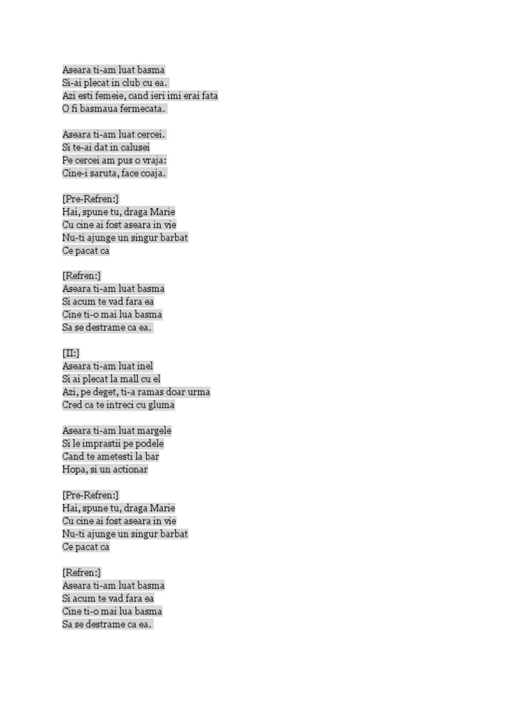 Sa se destrame ca ea la la. Aseară ţi am luat basma şi ai plecat la club cu ea azi eşti femeie când ieri îmi erai fată. Sa se spanzure ca ei la la. Asară ți am luat basma.