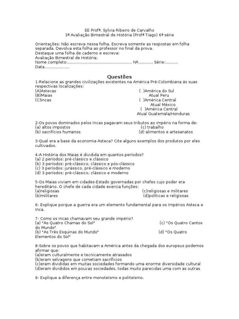 Entre As Linhas Da Historia Prova 7º Ano Maias Incas E Astecas