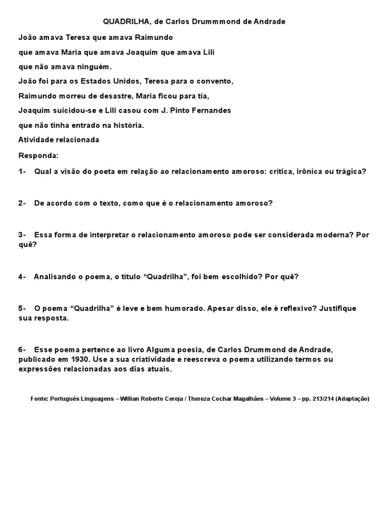 Atividades poema quadrilha carlos drummond andrade