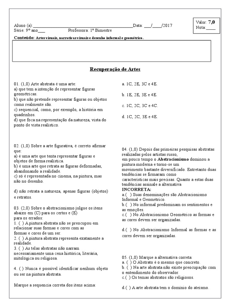 Atividades sobre arte figurativa e abstrata com gabarito