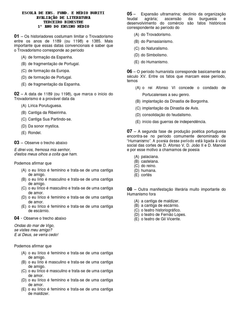 Exercicios Sobre Trovadorismo Com Gabarito Resumo