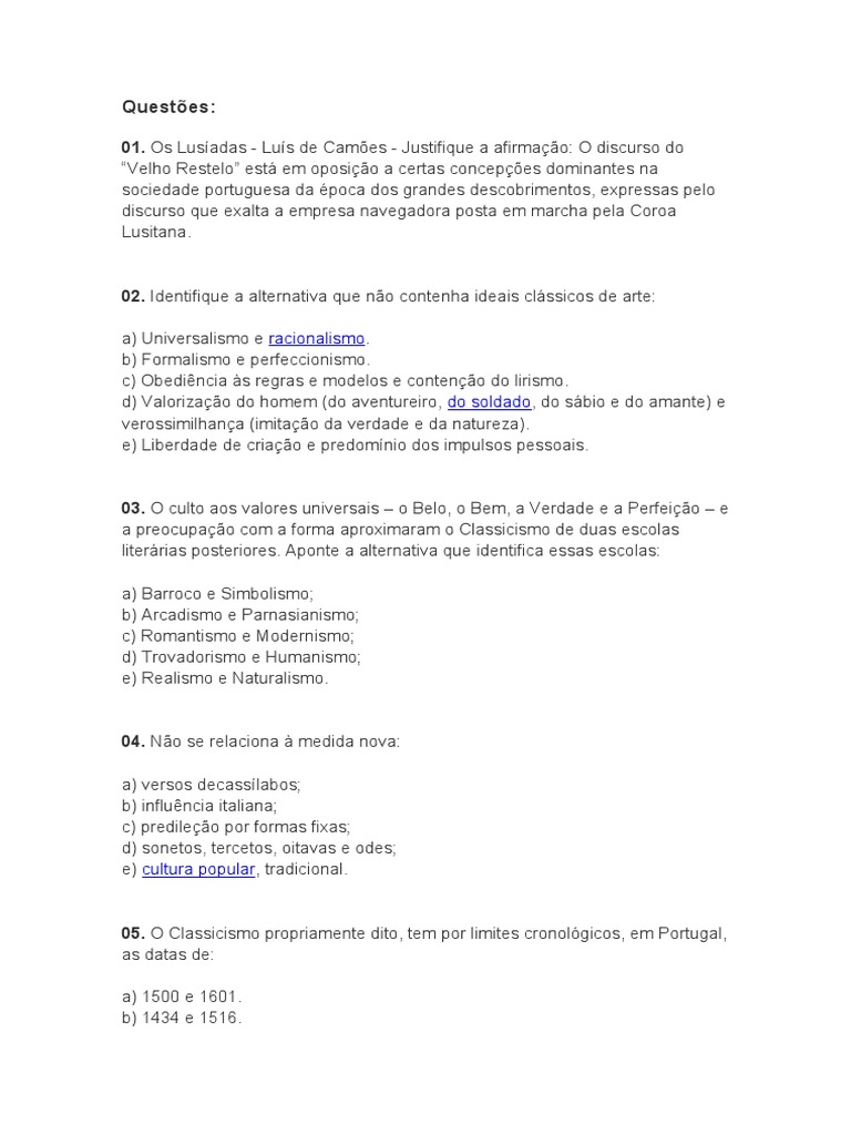 Questoes Sobre O Classicismo Portugues E Simples