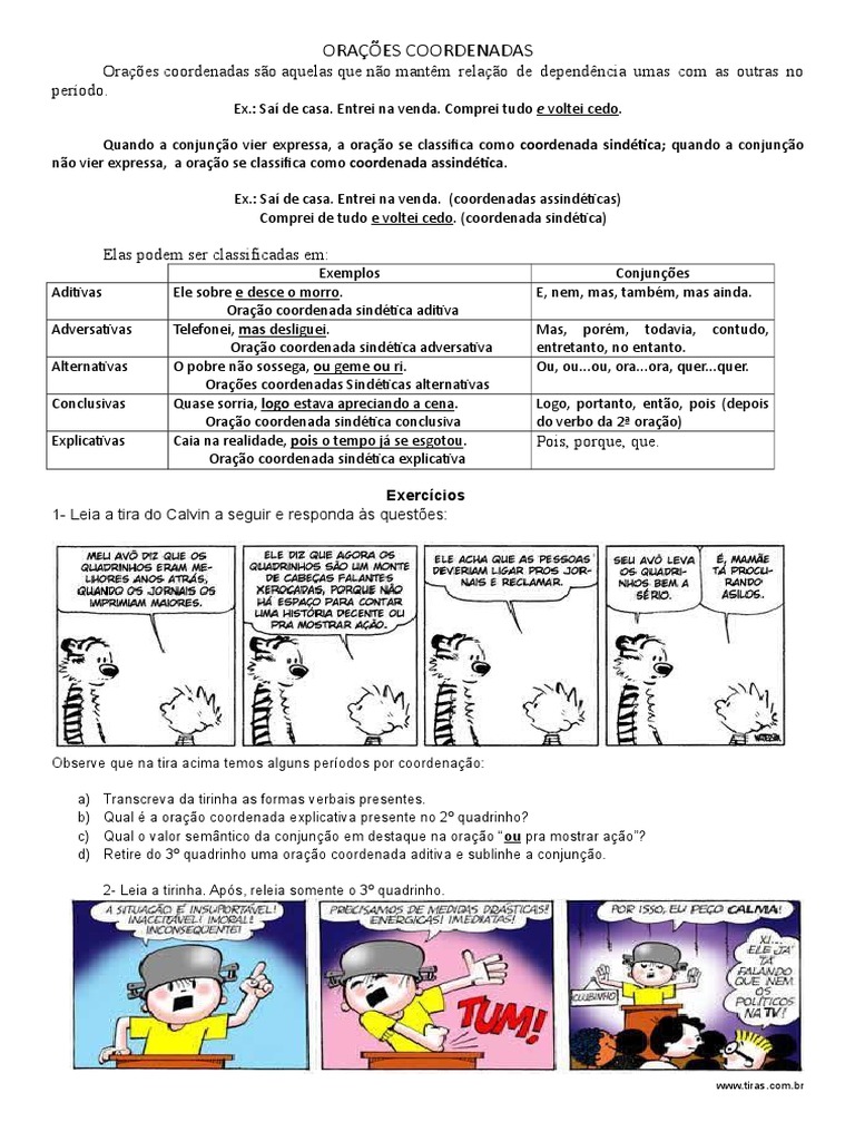 Atividades sobre orações coordenadas com tirinhas. A primeira oração a preguiça é a mãe de todos os vícios é uma oração coordenada assindética porque não possui conjunção coordenativa. Elas são classificadas em. Leia os enunciados a seguir. Analise as funções desempenhadas pelas orações subordinadas substantivas destacadas e classifique as.