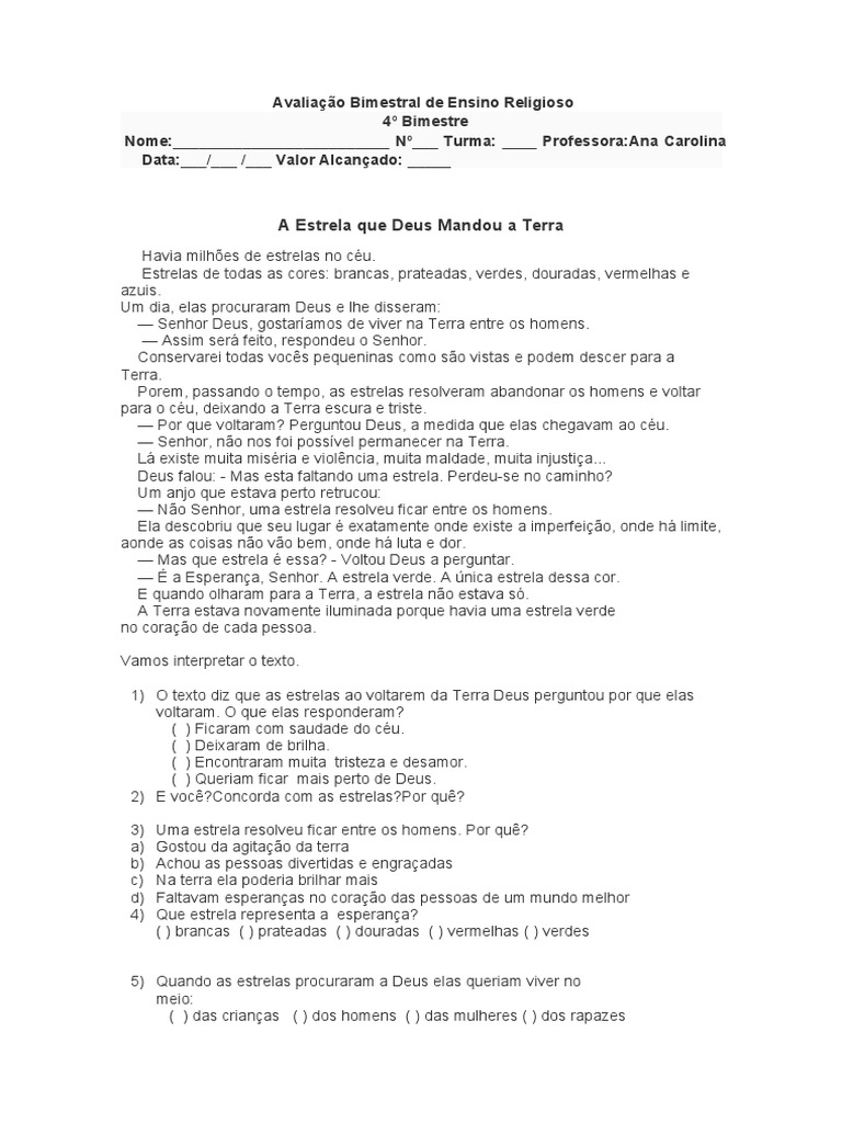 Avaliacao Bimestral De Ensino Religioso 4 Ceu Estrelas